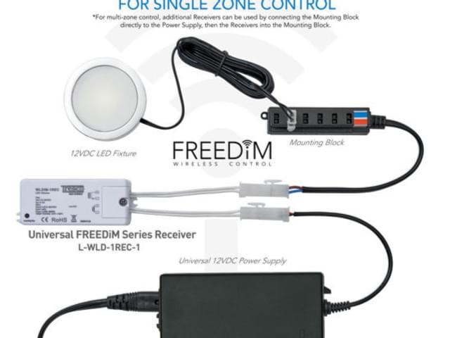 Tresco Lighting brings simplicity to your low voltage LED systems. Nowhere is this more evident than our new FREEDiM Series Universal Receiver. This Receiver connects between Tresco's Universal 12VDC Power Supply and any of our dimmable LED lights, then gets synced up with any of the four new FREEDiM Series Wireless Controller options (Deco Wall Dimmer, Micro Dimmer, and 3/6-Zone Remotes). One touch pairing makes programming your Controller and Receiver quick and easy. And each Receiver has a 60W capacity, meaning they can handle the full load of Tresco's largest 12VDC Power Supplies.