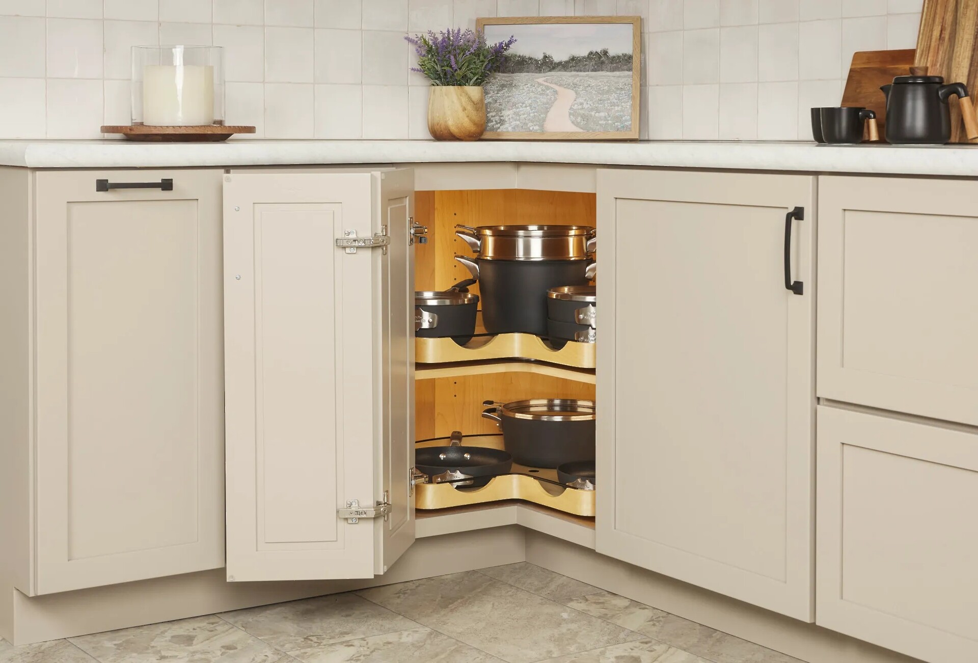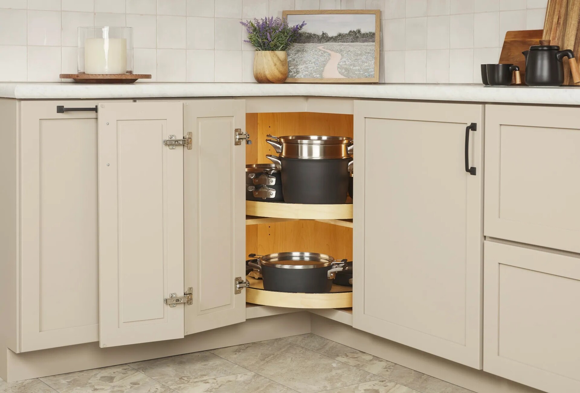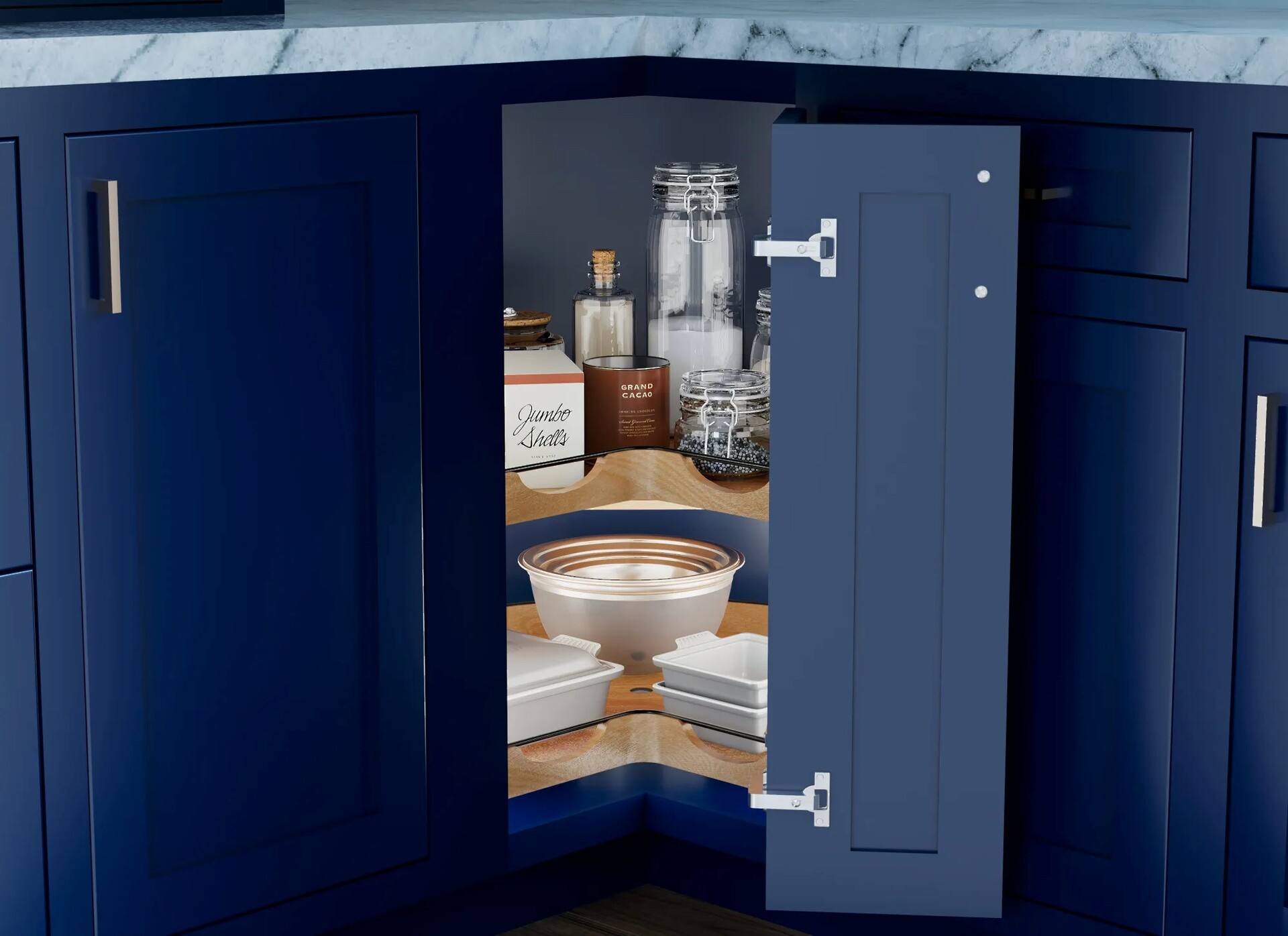 - Kidney-shaped lazy susans do not attach to the cabinet door