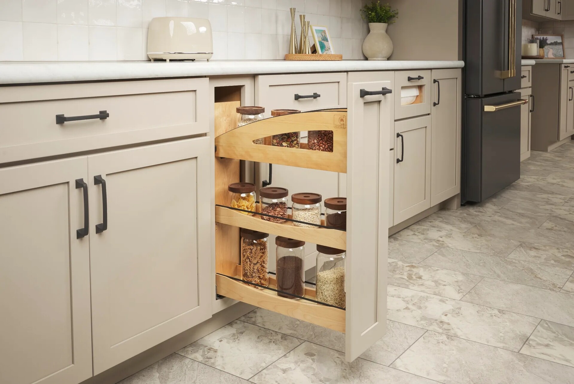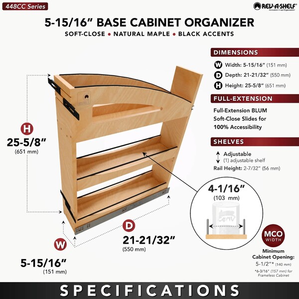 The classic 448 Series Base Cabinet Pullout Organizer has been beautifully reimagined with the 448CC Series, part of our sophisticated Craftsman Collection. This new design showcases clean lines, luxurious solid wood construction, and recessed black wire accents for a modern and elegant look. It includes a fixed top and bottom shelf, an adjustable middle shelf, and BLUM soft-close slides for smooth and quiet operation.