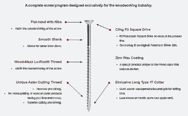 The Wood-Maxx is the ultimate wood screw. It has been specifically engineered and designed for manufacturers of solid wood or melamine furniture and kitchen cabinets. It features a long Type 17 (T17) cutter for quick drilling into even the hardest of woods.