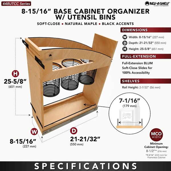 Keep your countertops organized and your kitchen coordinated with the 448UTCC Craftsman Collection Utensil Base Cabinet Pullout. Designed as part of our elegant Craftsman Collection, this organizer features solid maple construction, recessed black wire accents, and clean, soft lines. Available in two sizes, it includes a fixed upper shelf with up to four removable wire bins, a fixed lower shelf, and BLUM soft-close slides for smooth functionality.