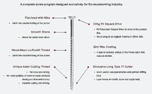 The Wood-Maxx is the ultimate wood screw. The specially designed cutting thread combined with our long T17 cutter eliminates the need for pre-drilling into most species of wood and sheet goods.