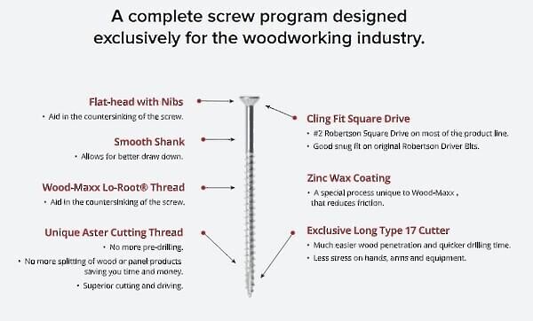 The Wood-Maxx is the ultimate wood screw. It has been specifically engineered and designed for manufacturers of solid wood or melamine furniture and kitchen cabinets. It features a long Type 17 (T17) cutter for quick drilling into even the hardest of woods. The specially designed cutting thread combined with our long T17 cutter eliminates the need for pre-drilling into most species of wood and sheet goods.