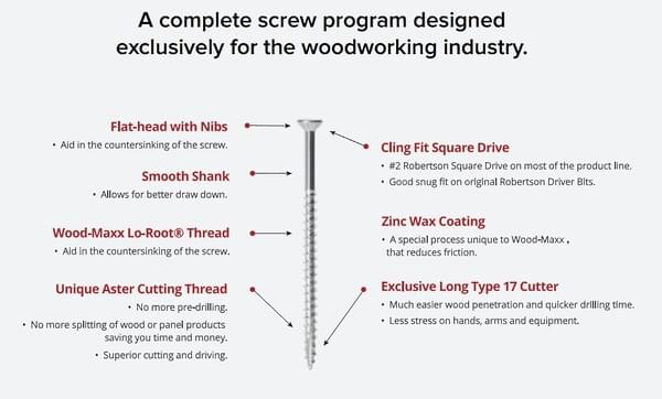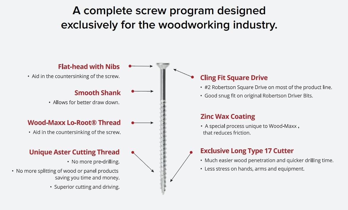 The Wood-Maxx is the ultimate wood screw. The specially designed cutting thread combined with our long T17 cutter eliminates the need for pre-drilling into most species of wood and sheet goods.