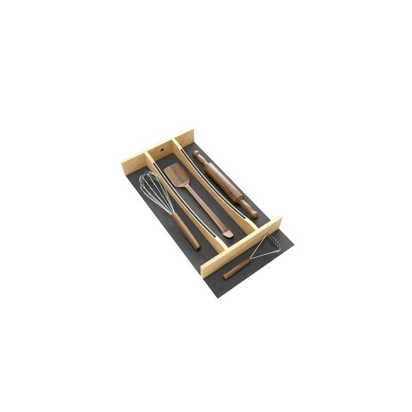 The 4WUTCC Series Craftsman Collection Utensil Tray Inserts by Rev-A-Shelf® offer a stylish solution for organizing your kitchen tools. Crafted from solid maple, these inserts effortlessly complement most cabinetry, while the recessed matte black wire accents add a modern touch. The distinctive curved design enhances functionality by providing both visual interest and greater accessibility to the drawer contents. Each insert comes with a durable black non-skid vinyl mat to keep your items securely in place. Enjoy easy, drop-in installation with no tools or trimming required.