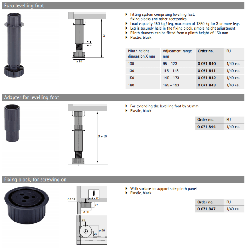 • Fitting system comprising levelling feet, fixing blocks and other accessories