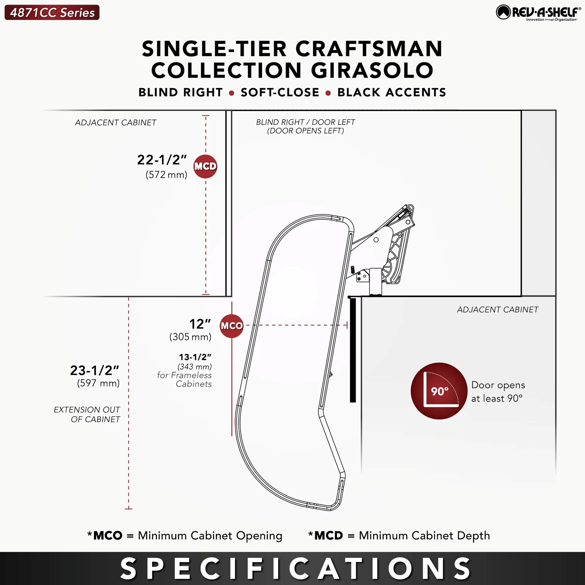 The 487CC Series Craftsman Collection "Girasolo" Blind Corner Optimizer by Rev-A-Shelf® offers a refined and sophisticated update to the classic Girasolo design. Crafted from maple with gracefully curved lines and soft edges, this innovative solution blends both elegance and practicality. The Girasolo glides effortlessly out of the cabinet on a soft-close pivot hardware system, eliminating the need for adjacent appliance clearance and maximizing accessibility. Designed for both right and left blind corner cabinet openings, it is available in multiple sizes and single or two-tier configurations, providing versatile storage options for hard-to-reach spaces.