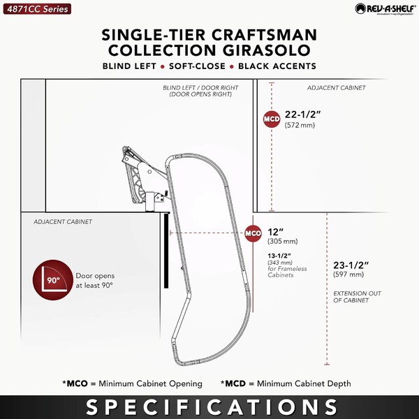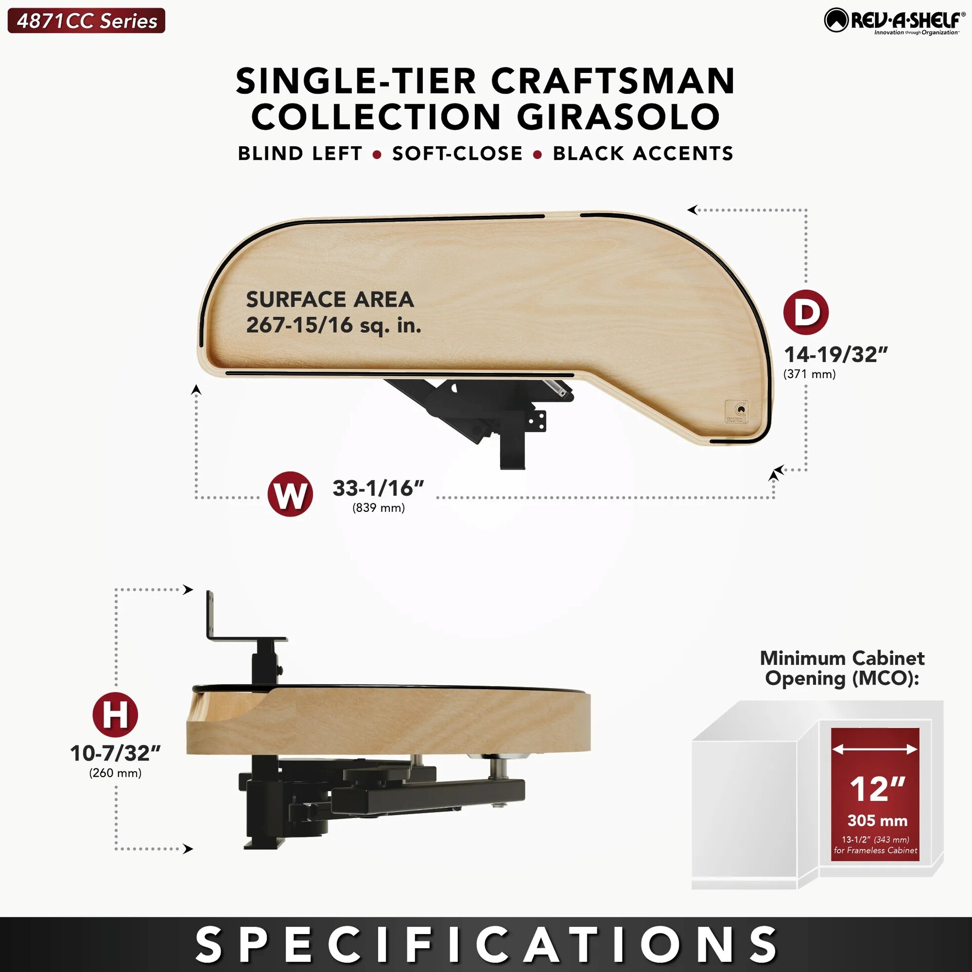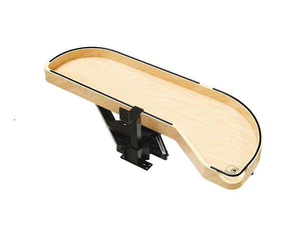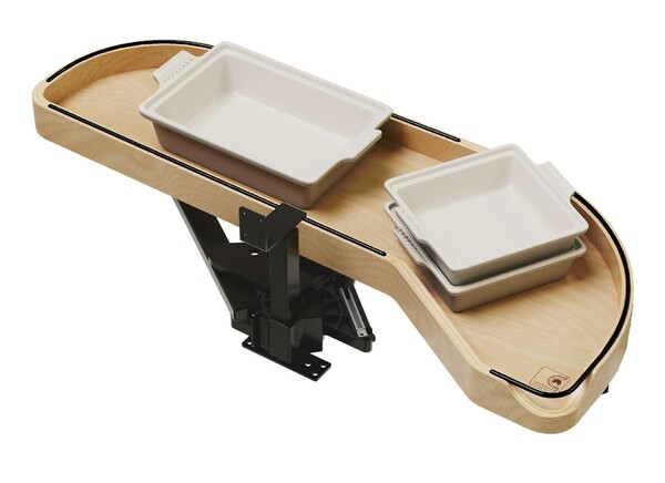 The 487CC Series Craftsman Collection "Girasolo" Blind Corner Optimizer by Rev-A-Shelf® offers a refined and sophisticated update to the classic Girasolo design. Crafted from maple with gracefully curved lines and soft edges, this innovative solution blends both elegance and practicality. The Girasolo glides effortlessly out of the cabinet on a soft-close pivot hardware system, eliminating the need for adjacent appliance clearance and maximizing accessibility. Designed for both right and left blind corner cabinet openings, it is available in multiple sizes and single or two-tier configurations, providing versatile storage options for hard-to-reach spaces.
