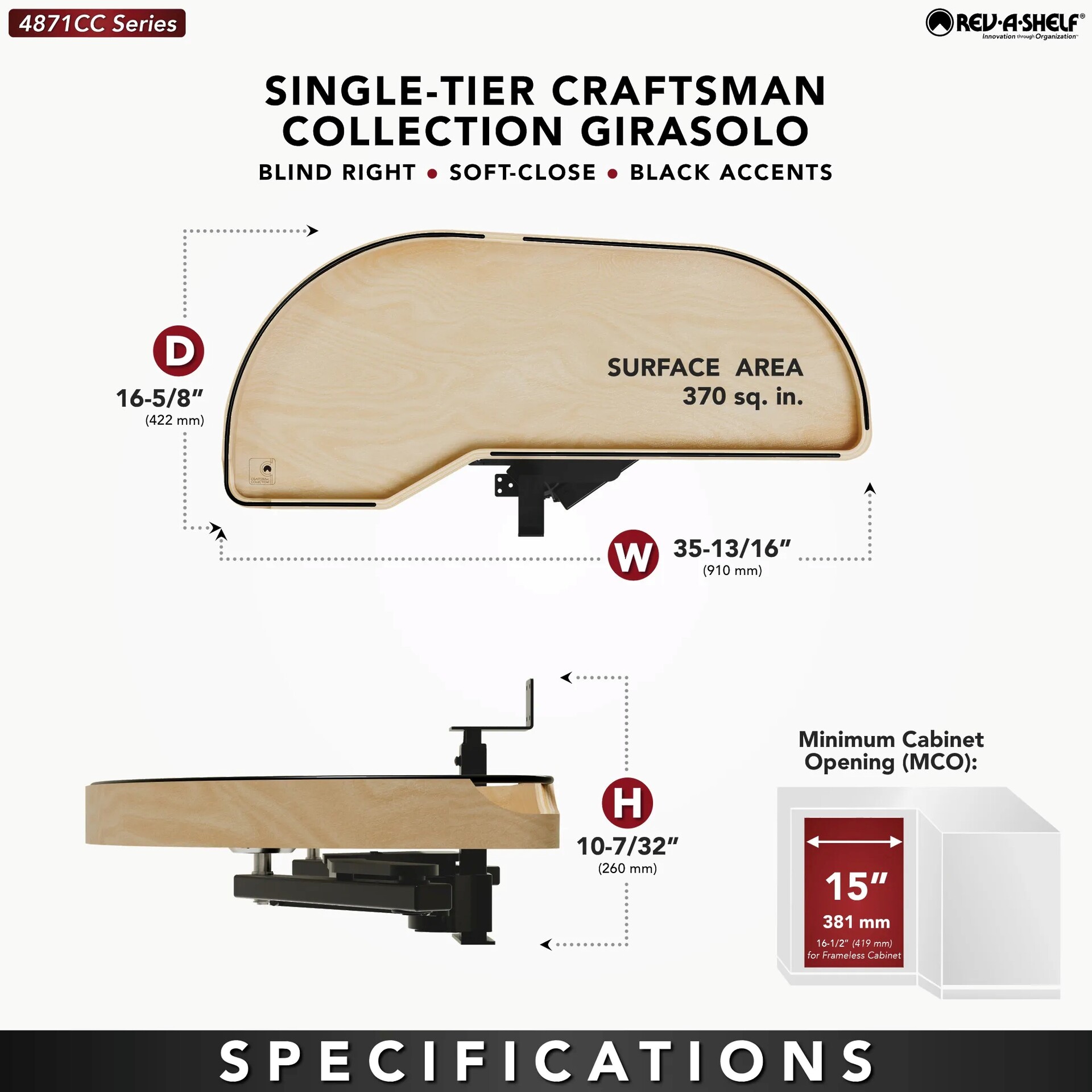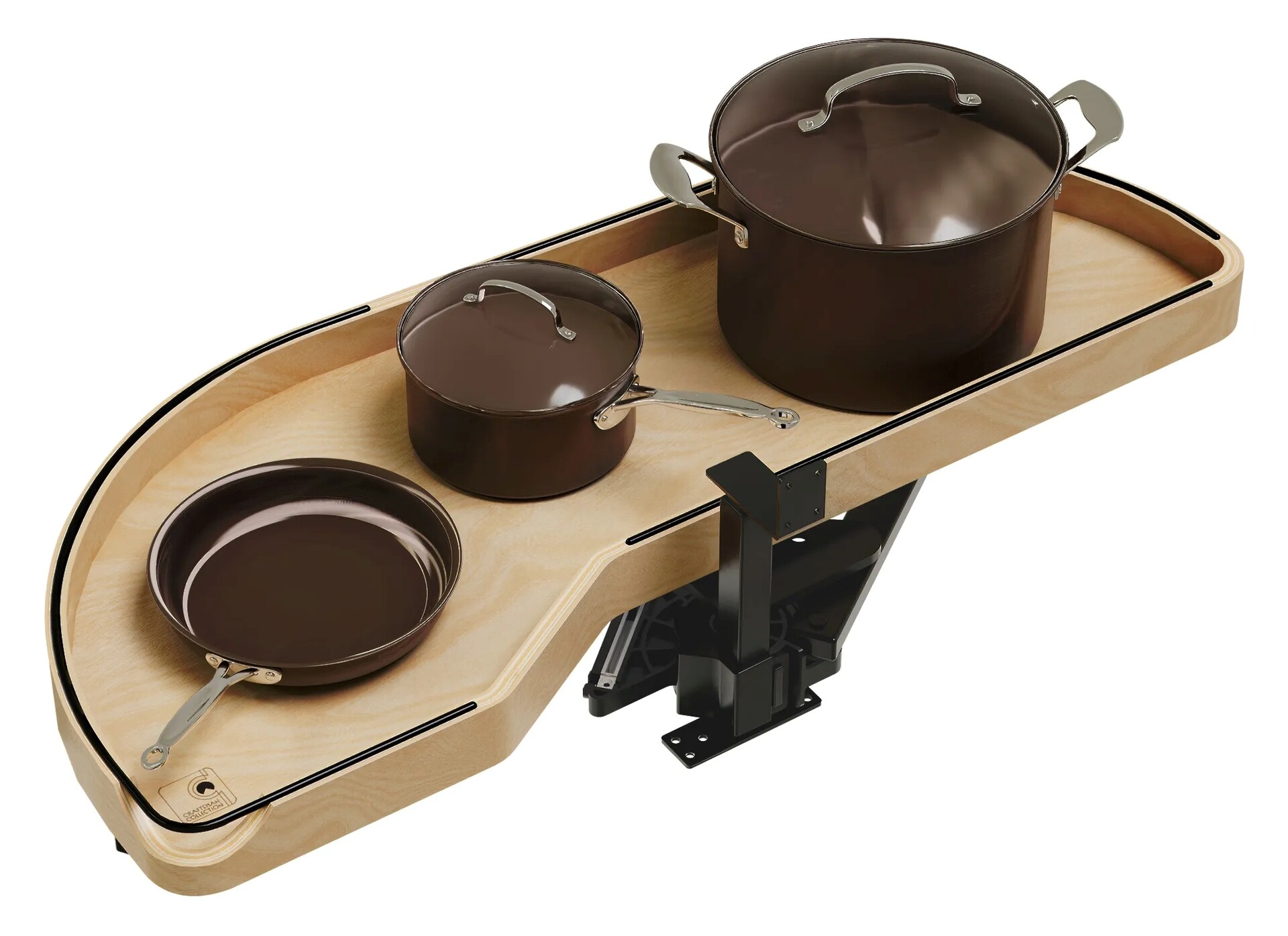The 487CC Series Craftsman Collection "Girasolo" Blind Corner Optimizer by Rev-A-Shelf® offers a refined and sophisticated update to the classic Girasolo design. Crafted from maple with gracefully curved lines and soft edges, this innovative solution blends both elegance and practicality. The Girasolo glides effortlessly out of the cabinet on a soft-close pivot hardware system, eliminating the need for adjacent appliance clearance and maximizing accessibility. Designed for both right and left blind corner cabinet openings, it is available in multiple sizes and single or two-tier configurations, providing versatile storage options for hard-to-reach spaces.