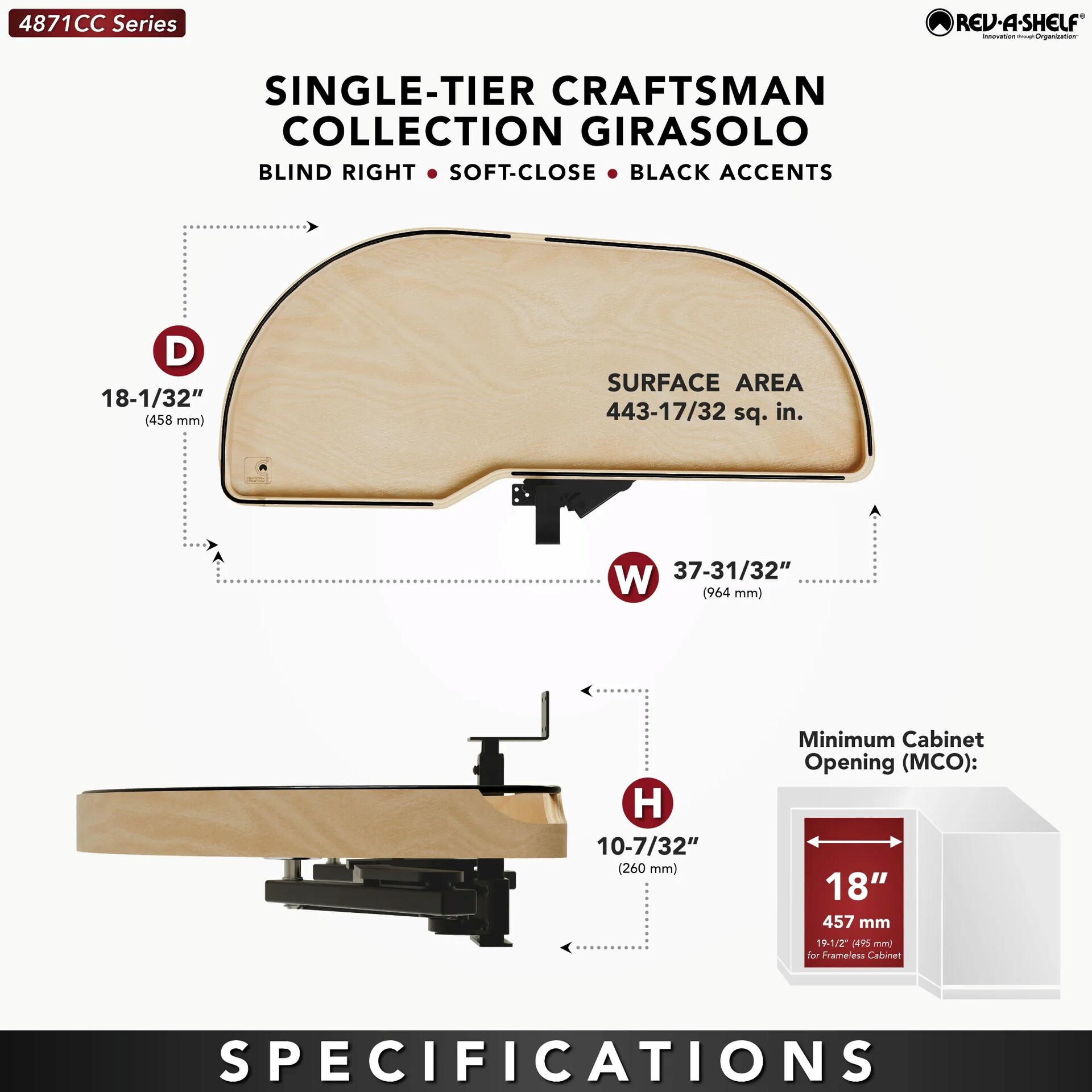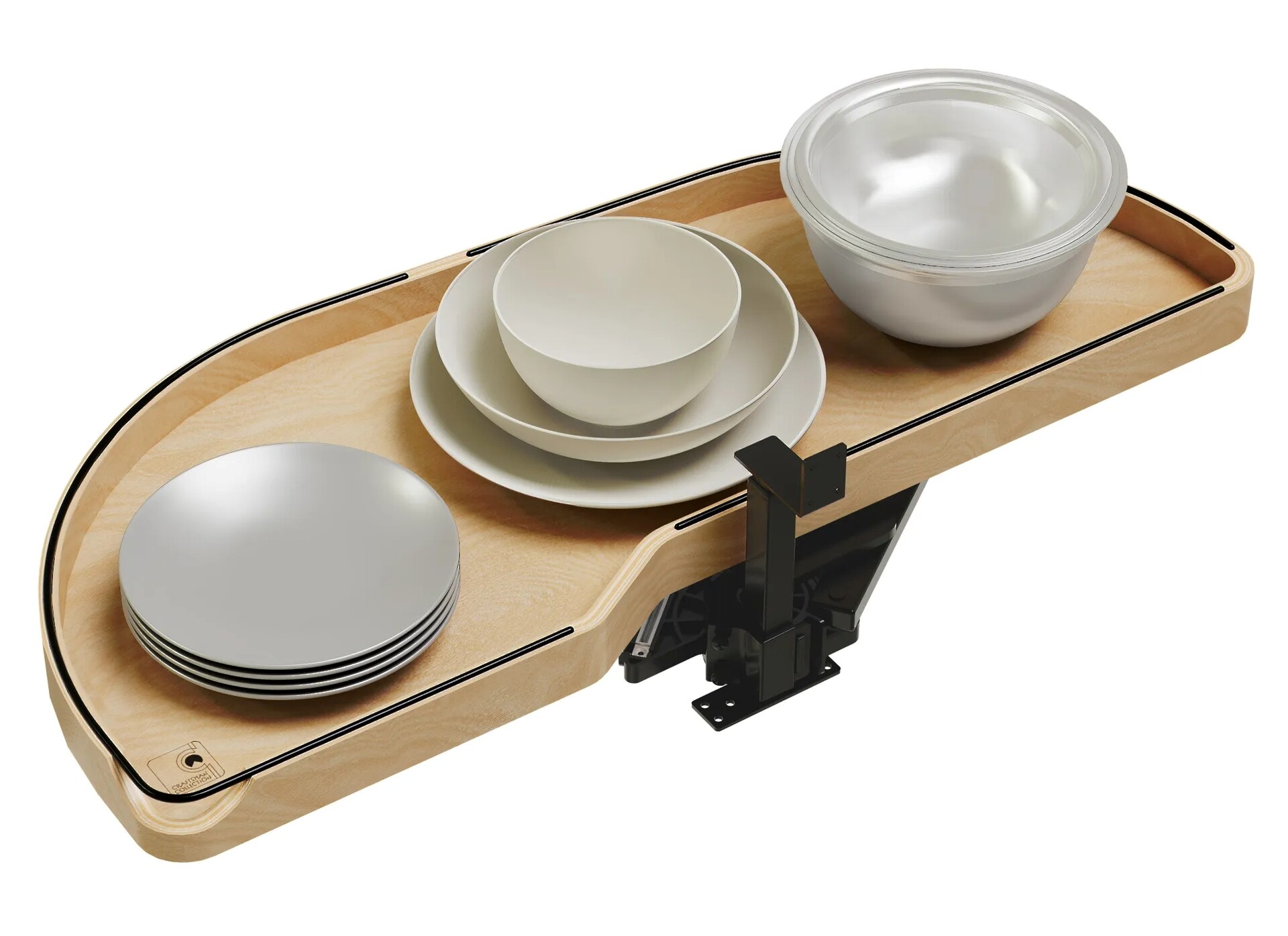 The 487CC Series Craftsman Collection "Girasolo" Blind Corner Optimizer by Rev-A-Shelf® offers a refined and sophisticated update to the classic Girasolo design. Crafted from maple with gracefully curved lines and soft edges, this innovative solution blends both elegance and practicality. The Girasolo glides effortlessly out of the cabinet on a soft-close pivot hardware system, eliminating the need for adjacent appliance clearance and maximizing accessibility. Designed for both right and left blind corner cabinet openings, it is available in multiple sizes and single or two-tier configurations, providing versatile storage options for hard-to-reach spaces.