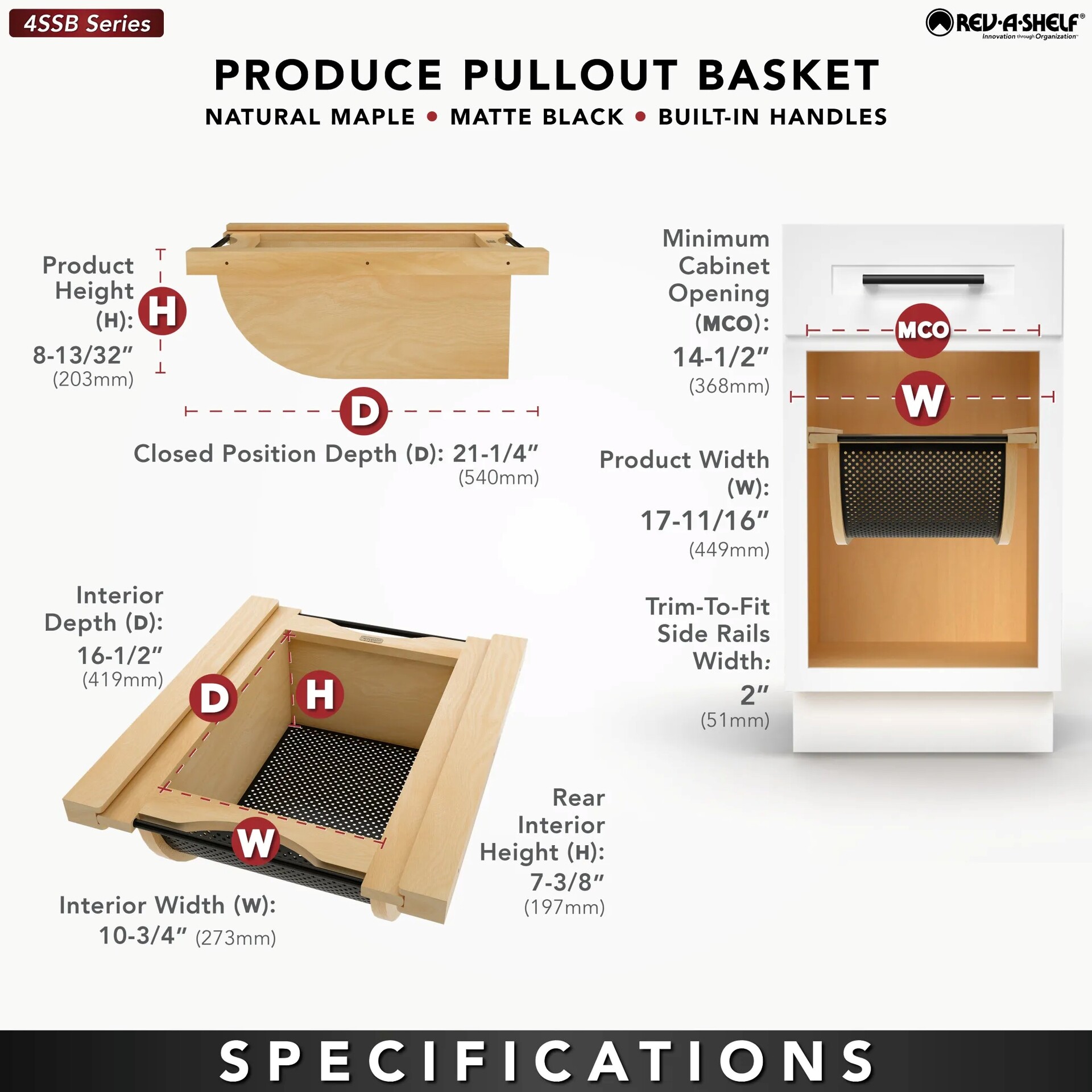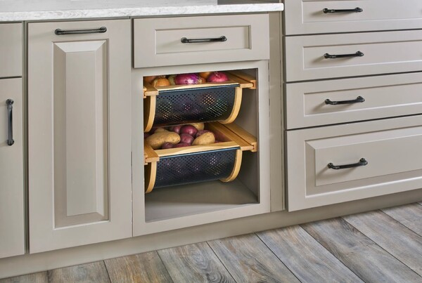 Store your produce in style with the 4SSB Series Stainless-Steel Produce Baskets! These removable baskets are designed for base cabinets and intended for use without cabinet doors. They are available in your choice of walnut or maple construction and feature either a stainless-steel bottom with matching handles or a luxurious black bottom with matching handles. The perforated design promotes ample air circulation and prevents moisture buildup, keeping your fruits and vegetables fresher for longer. Enjoy simple installation with trim-to-fit side rails and easy transportation using the built-in handles.