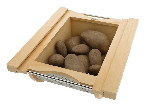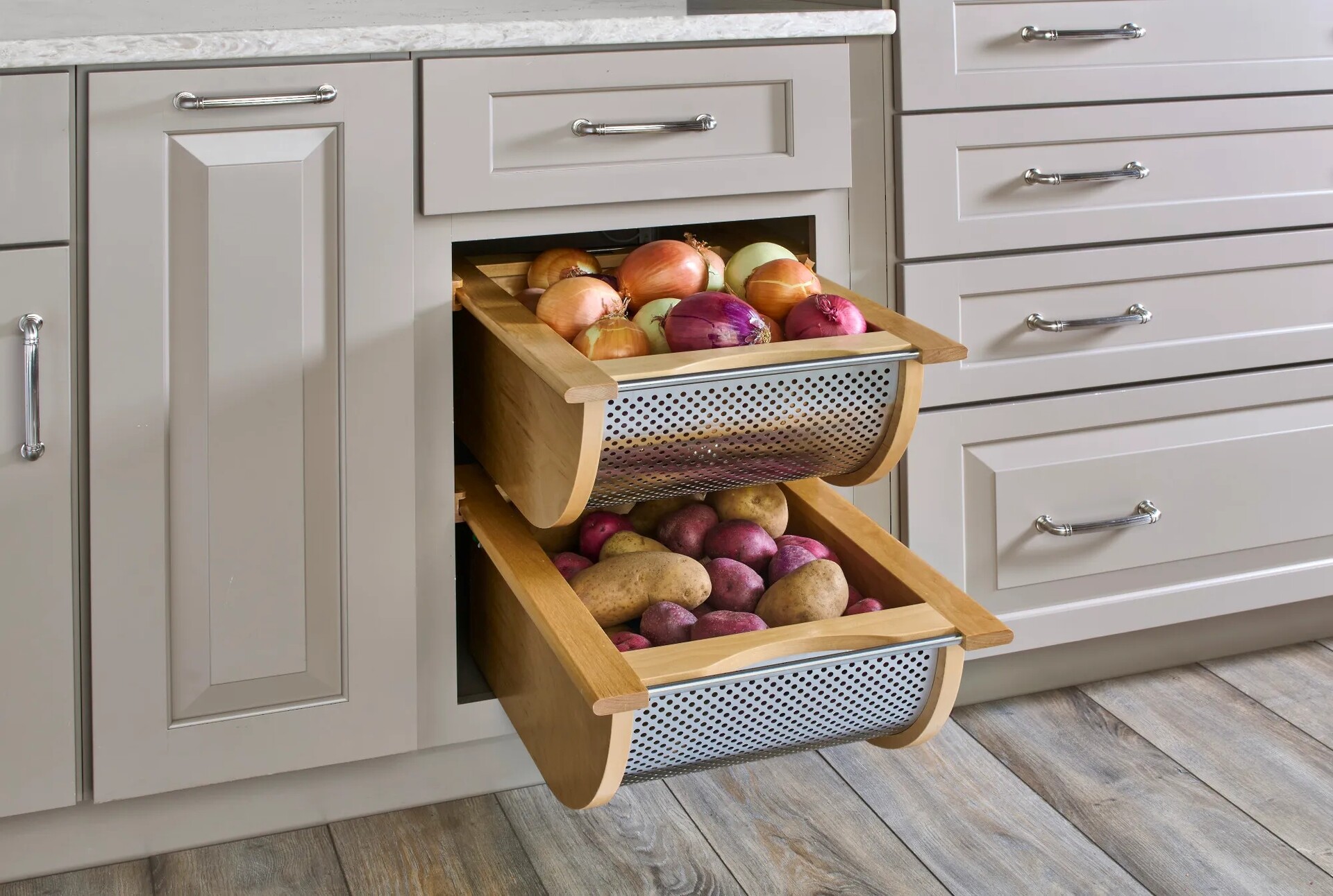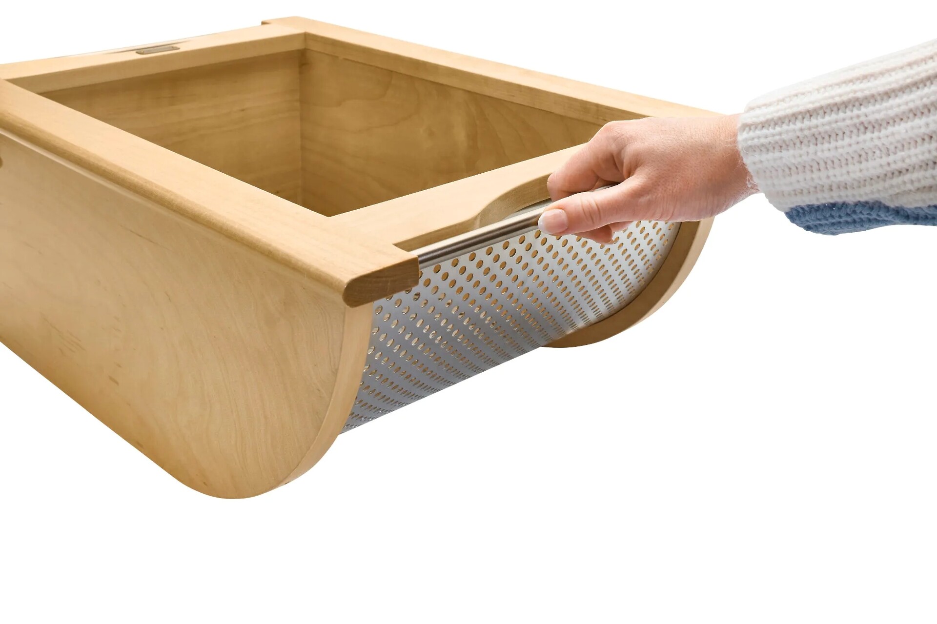 Store your produce in style with the 4SSB Series Stainless-Steel Produce Baskets! These removable baskets are designed for base cabinets and intended for use without cabinet doors. They are available in your choice of walnut or maple construction and feature either a stainless-steel bottom with matching handles or a luxurious black bottom with matching handles. The perforated design promotes ample air circulation and prevents moisture buildup, keeping your fruits and vegetables fresher for longer. Enjoy simple installation with trim-to-fit side rails and easy transportation using the built-in handles.