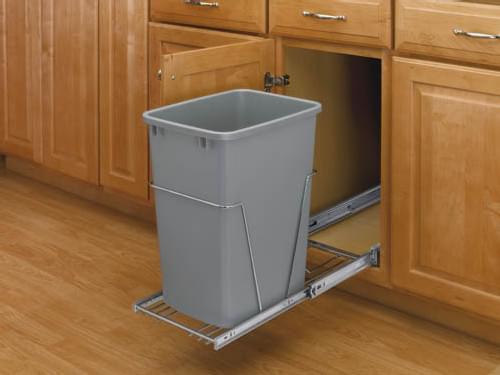 Our extremely popular RV-Series Waste Container is regarded as the best in the industry, the RV Series features a heavy-duty wire frame construction; full-extension ball bearing slides and easy bottom mount installation with just four screws. These durable pullout waste containers carry the standard Rev-A-Shelf LIFETIME GUARANTEE.