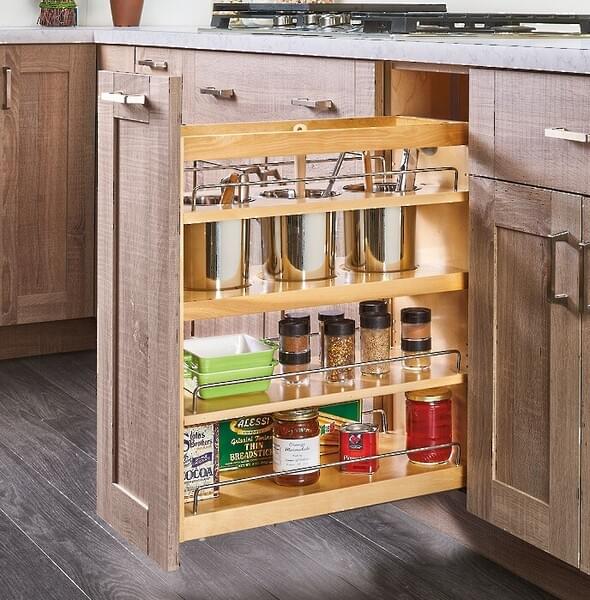 Short on drawer space and forced to use a utensil holder that you must move every time you need additional counter space? Rev-A-Shelf has the answer with our bottom and side mount utensil pullout shelving system complete with three removable bins to hold cooking utensils and more. Available in varying sizes, they door mount and come with shelves for additional storage.
