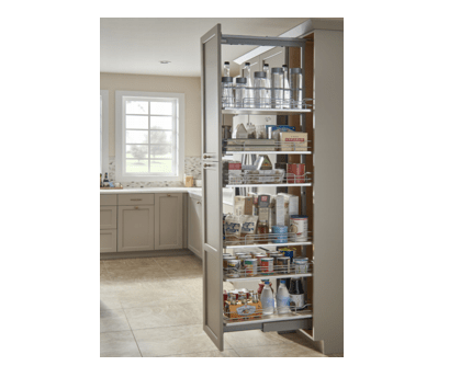 Rev-A-Shelf’s 5300 Pullout Pantry Series is the answer to your full access (frameless) cabinetry needs. The series offers basket depths for 24" deep cabinetry and comes in five different widths and four height ranges, one width available for face frame cabinets. Available in your choice of beautiful maple or contemporary gray solid bottom to match every kitchen style.