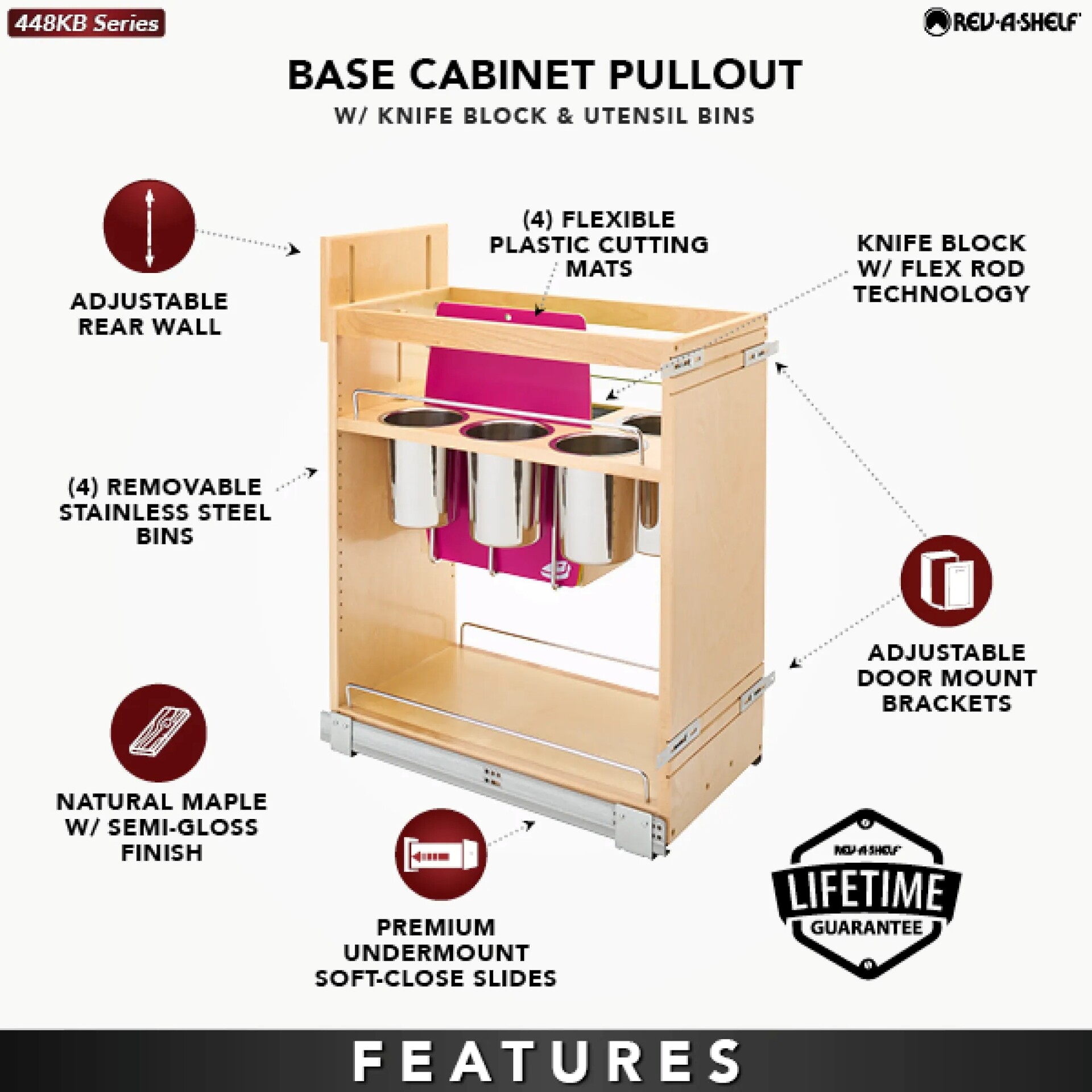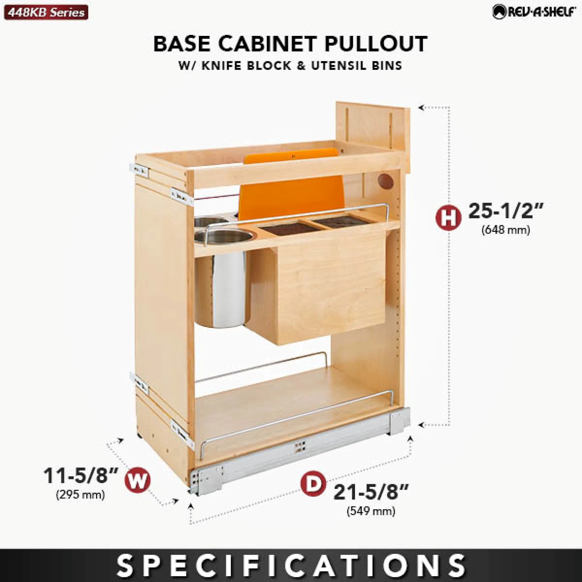 Every great chef knows that you are only as good as your knives but having so many sizes and brands makes storing them a nightmare. That is no longer a concern with our 448KB Organizer with Blumotion Soft-Close. This unit features two universal knife inserts, stainless steel utensil bin, and adjustable shelf for lower storage.