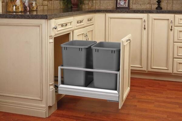 • Depending on cabinet construction and pull hardware, a lid on the rear waste bin may not fully function. (Lids Sold Separately)