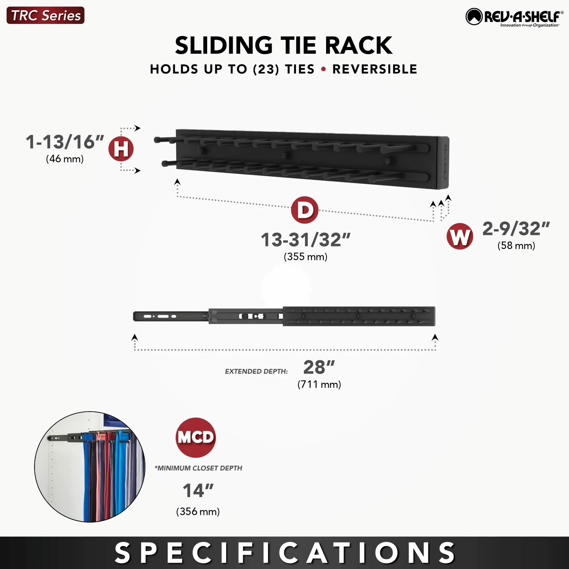 Our TRC Tie Rack has been redesigned with your needs in mind from the additional finishes to shorter prongs we have listened to your needs and delivered. The design pulls out for full accessibility, is available in three finishes, and is ideal for 14” depth closet applications.