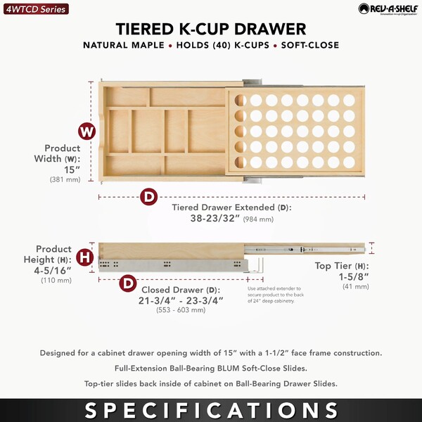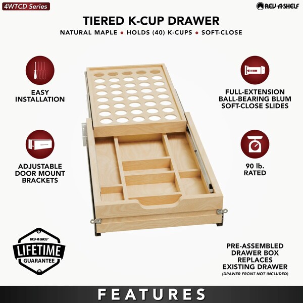 Double up your drawer space with Rev-A-Shelf's Two-Tiered drawer. This drawer box comes pre-assembled and ready to install into your existing cabinet drawer opening.