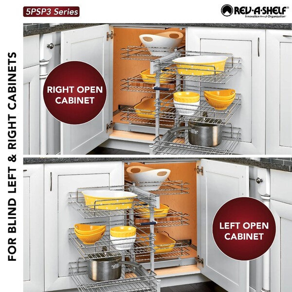 Rev-A-Shelf's 5PSP Series maximizes space in blind corner cabinets while allowing the user full accessibility to the entire unit. The unit is easy to assemble and installs for either left or right-handed applications. This chrome blind corner optimizer fits most 48" blind corner cabinets.