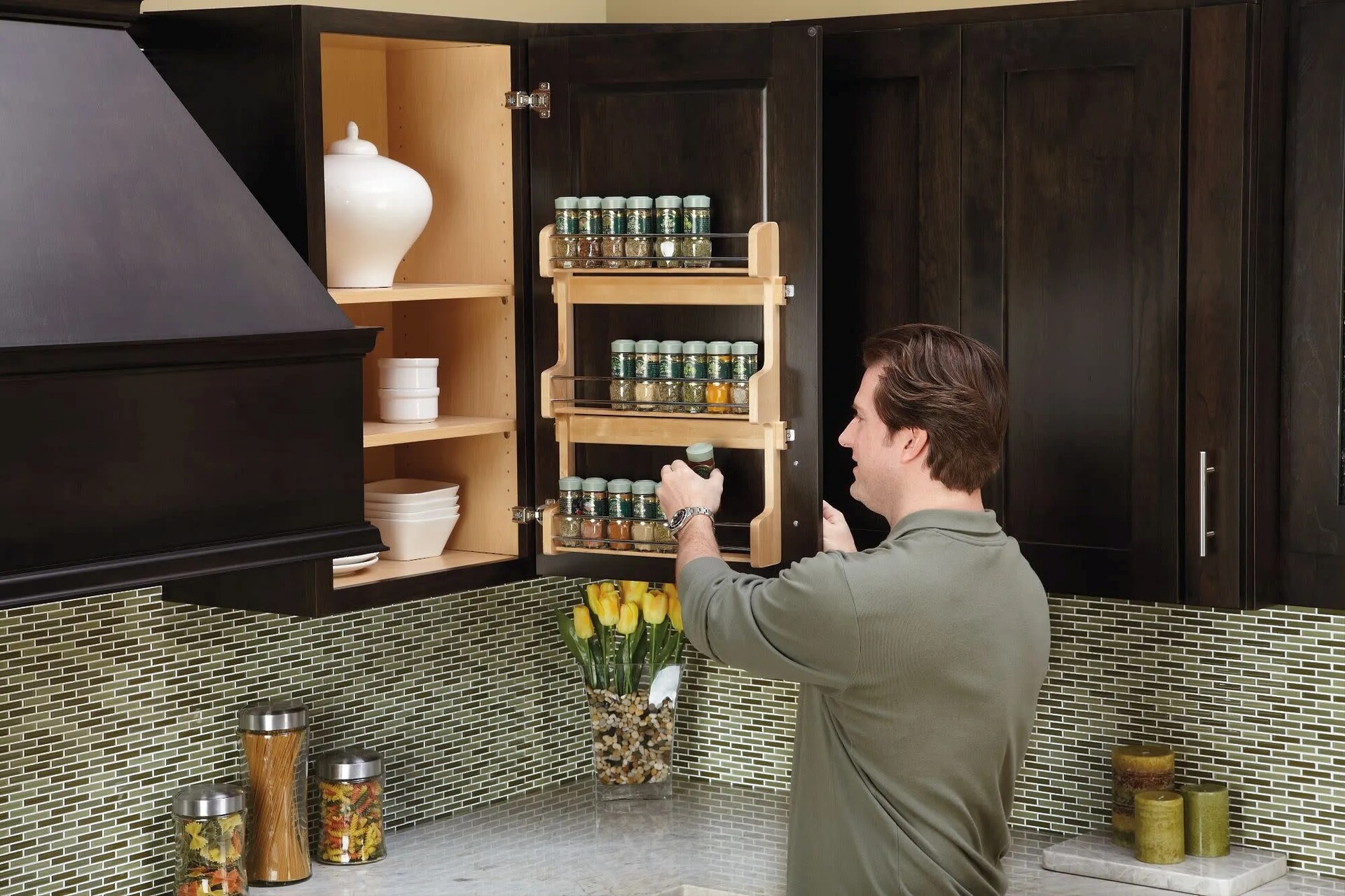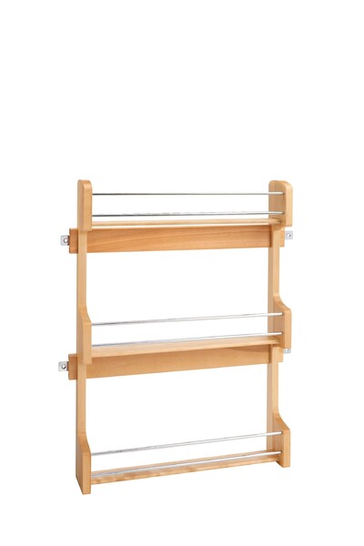 Maintain shelf space and keep spices within reach with a Wood Classic Door Mount Spice Rack. Made of attractive maple hardwood, this storage saver is available for Wall 15", 18" and 21" cabinets. The 4SR Series features a UV-Cured clear finish that ensures an acceptable match to most cabinets and easily installs with just four screws.