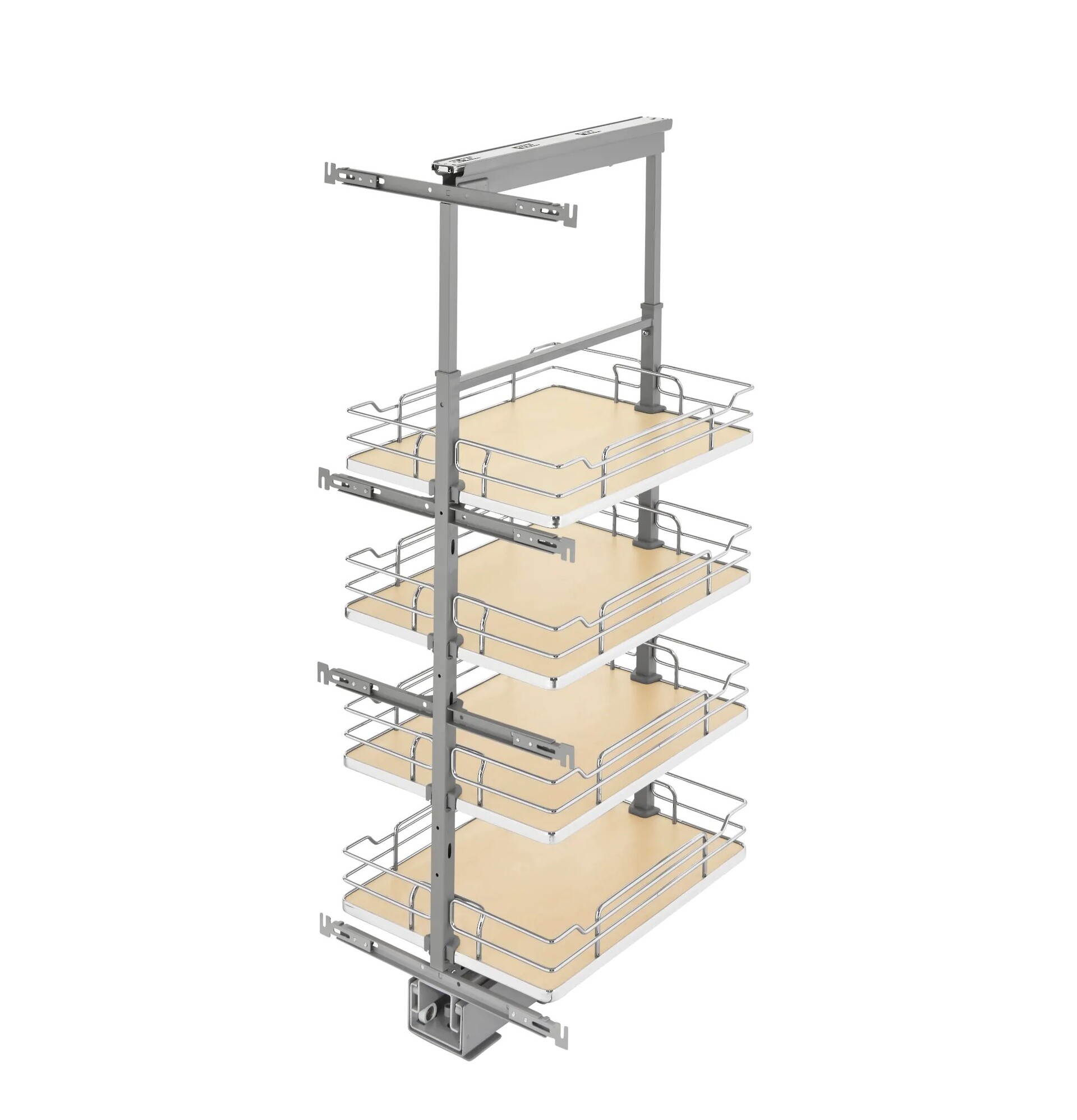 Rev-A-Shelf’s 5300 Pullout Pantry Series is the answer to your full access (frameless) cabinetry needs. The series offers basket depths for 24" deep cabinetry and comes in five different widths and four height ranges, one width available for face frame cabinets. Available in your choice of beautiful maple or contemporary gray solid bottom to match every kitchen style.
