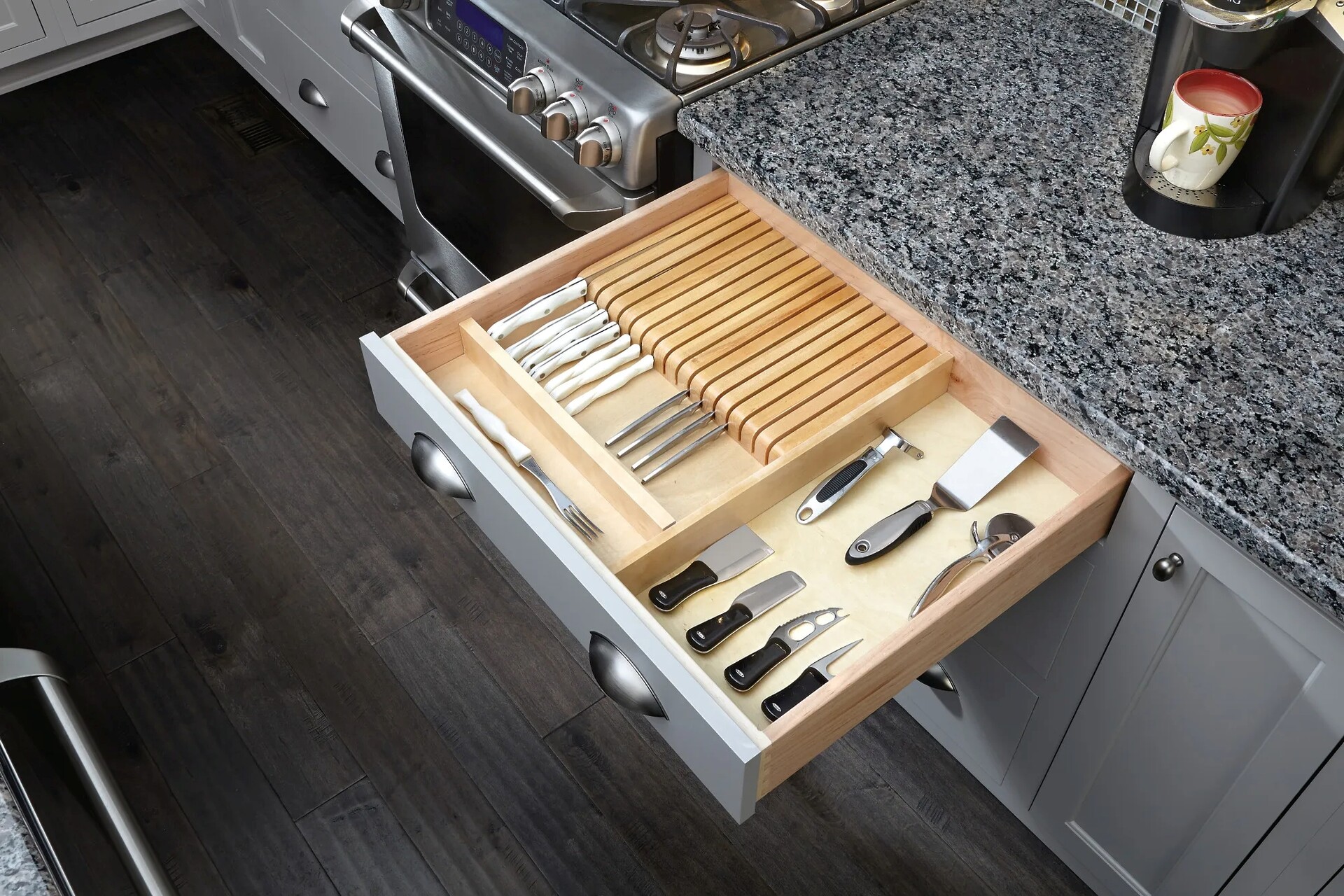 Rev-A-Shelf's unique 4WKB-1 Knife Block Tray Insert is out of the box ready at 18-1/2" x 22" providing 19 slots to store knives and has a separate compartment for other utensils. The unique design provides more storage then a traditional Knife Block and with its simple drop-in installation valuable counter top space is available to use immediately. Made of our classic hardwood with a UV cured clear finish to ensure an acceptable match to any kitchen cabinet and can be trimmed to fit drawers of various widths and lengths.