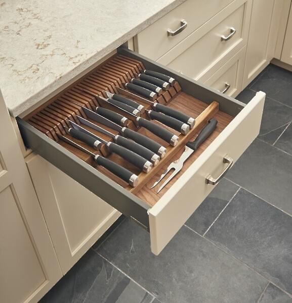 Slice and dice your way to a clutter-free kitchen with our trimmable knife block insert! These two-tiered organizers feature a 55-slot storage capacity for knives of varying sizes, easy drop-in installation, and a unique hilt rest that keeps your knives straight and provides ample finger space for removal. Available in maple or walnut, these trim-to-fit inserts can be used independently in drawers from 12.5" to 18.5", or in combination with our other drawer inserts for even more organization.