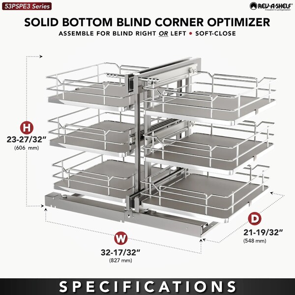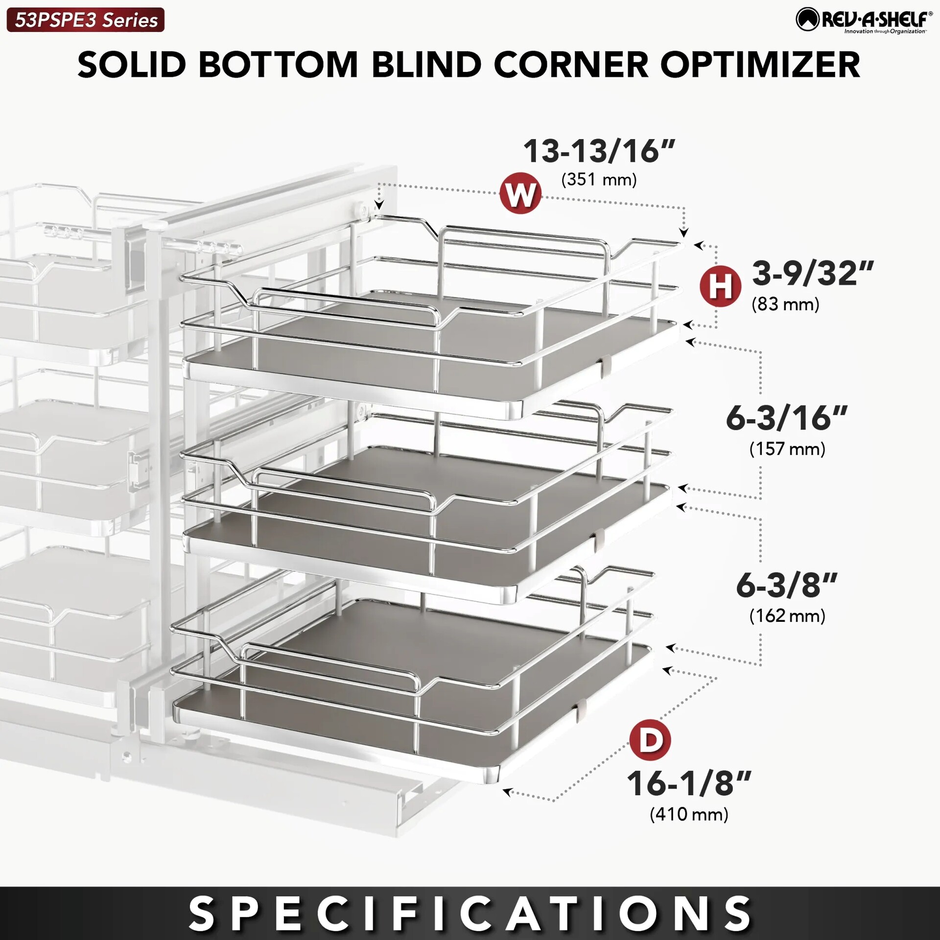 Give your blind corner cabinet an elite upgrade with the 53PSPE Series Elite Blind Corner Optimizer from Rev-A-Shelf®. This innovative solution takes functionality to the next level, featuring upper shelves that slide independently from the lower ones for easy access to every inch of your cabinet. Available in multiple sizes, finishes, and two- or three-tier configurations, this non-handed design ensures a seamless fit in both left- and right-handed applications, making installation a breeze.
