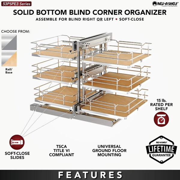 Give your blind corner cabinet an elite upgrade with the 53PSPE Series Elite Blind Corner Optimizer from Rev-A-Shelf®. This innovative solution takes functionality to the next level, featuring upper shelves that slide independently from the lower ones for easy access to every inch of your cabinet. Available in multiple sizes, finishes, and two- or three-tier configurations, this non-handed design ensures a seamless fit in both left- and right-handed applications, making installation a breeze.