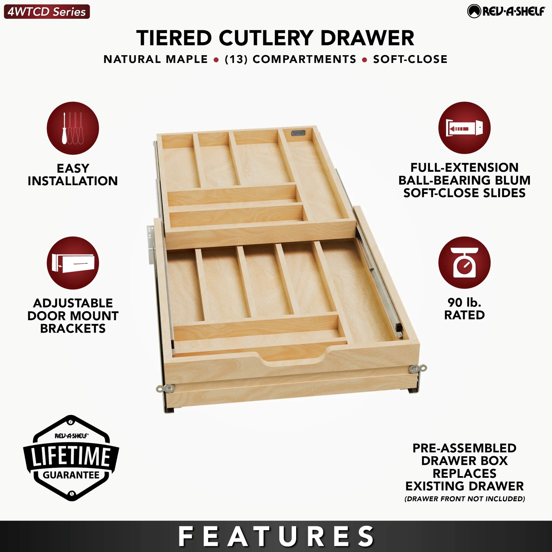 Double up your drawer space with Rev-A-Shelf's Two-Tiered drawer. This drawer box comes pre-assembled and ready to install into your existing cabinet drawer opening.