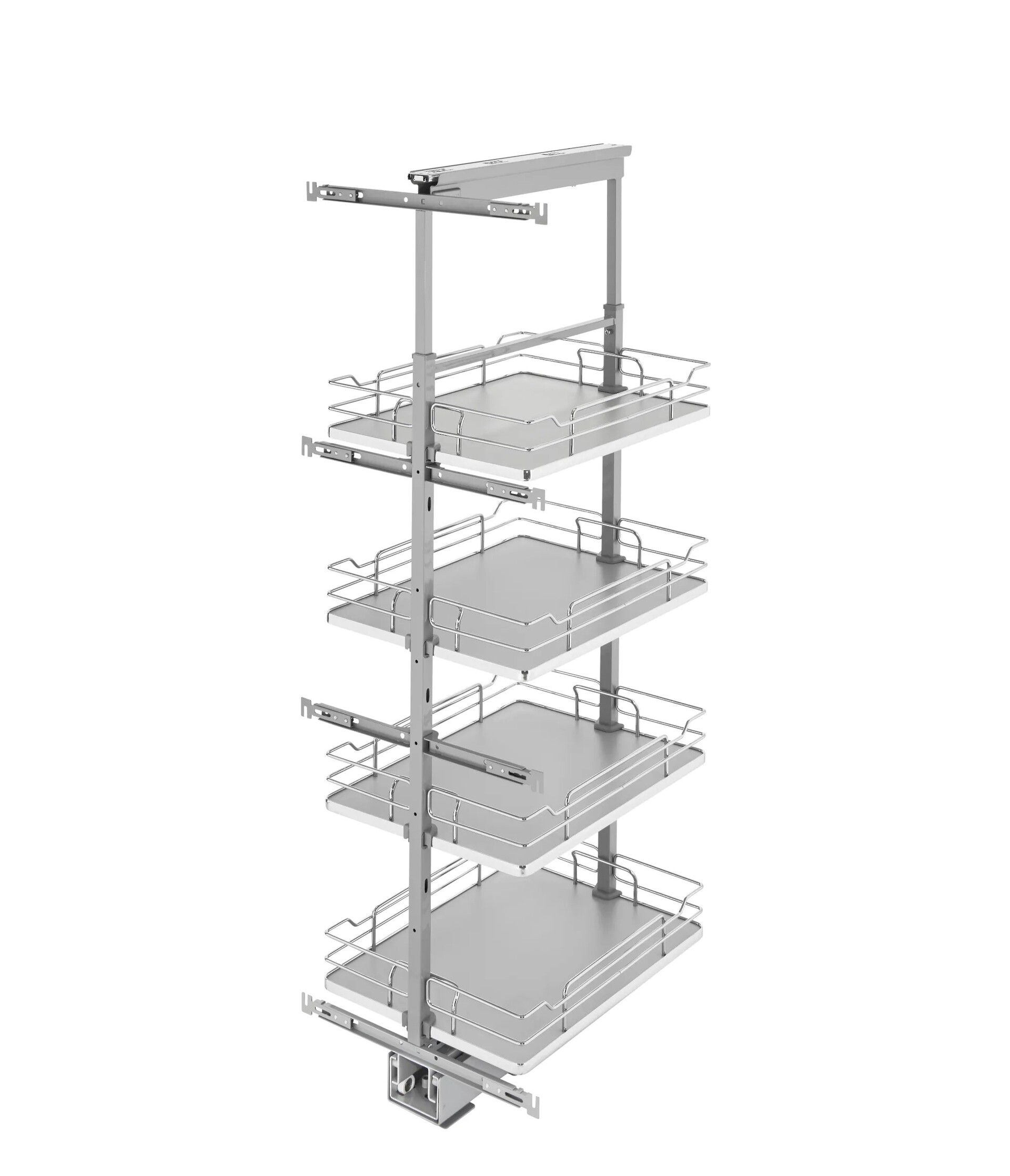 Rev-A-Shelf’s 5300 Pullout Pantry Series is the answer to your full access (frameless) cabinetry needs. The series offers basket depths for 24" deep cabinetry and comes in five different widths and four height ranges, one width available for face frame cabinets. Available in your choice of beautiful maple or contemporary gray solid bottom to match every kitchen style.