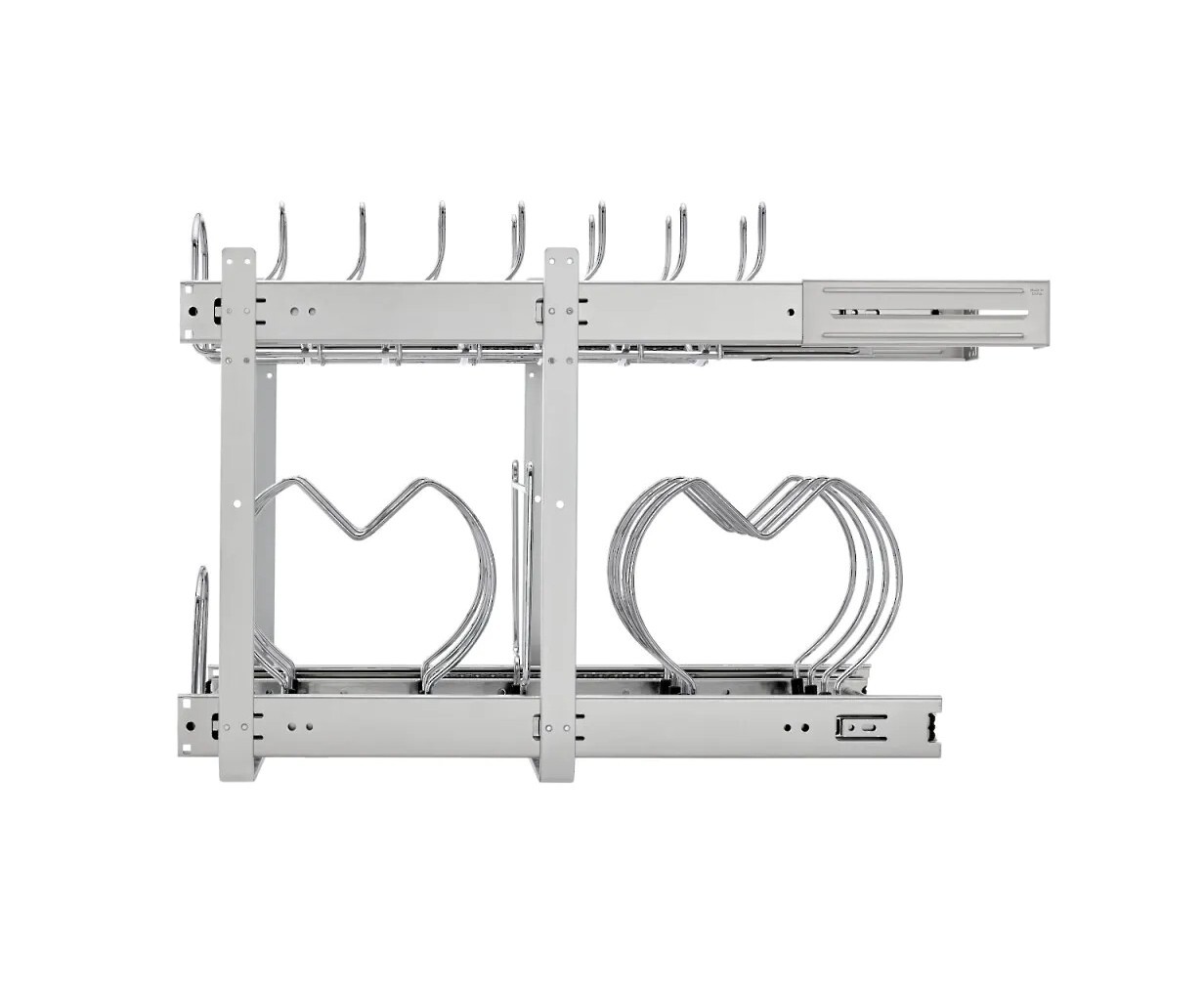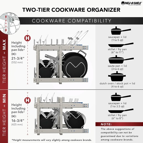 Revolutionize the way you store your pots, pans, and lids with Rev-A-Shelf's Two-Tier Cookware Organizer. The 5CW2 features independently operating shelves that accommodate a variety of cookware sizes and brands. The top tier organizes lids and the bottom tier features adjustable dividers to store a variety of large pots and pans. Made with a heavy duty chrome plated wire frame and 100 lb. rated full-extension soft-close ball-bearing slides. The bottom, side, and rear mounting provide you the sturdiness you expect and easy installation. Optional Door mounting kit available with the 5WB-DMKIT.