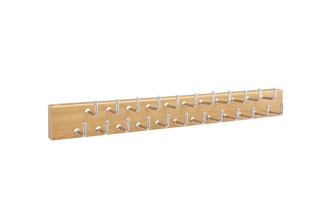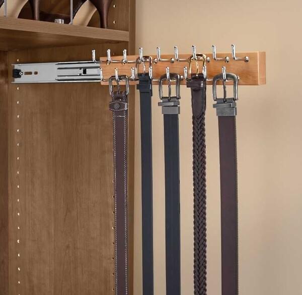Buckle up your disorganization with our Side Mount Wood Belt Racks. Available in Two sizes they hold up to 23 belts and come in maple finish. The side mountdesign is great for 3" wide spaces, is fully accessible on full-extension slides and features removable pegs for easy customization.