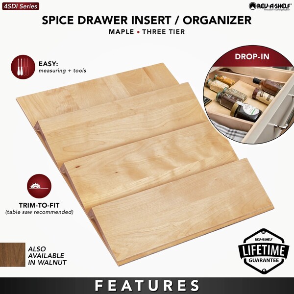 The popular Rev-A-Shelf 4SDI Spice Drawer Inserts are available in beautiful maple or walnut! Designed for 36" or smaller base cabinet drawers, this trim-to-fit insert features walnut or maple construction with a satin finish, one rear storage compartment and up to (3) tiers for all your spices. Combine with our 4WD Wood Dividers or use individually to fit your exact organizational needs.
