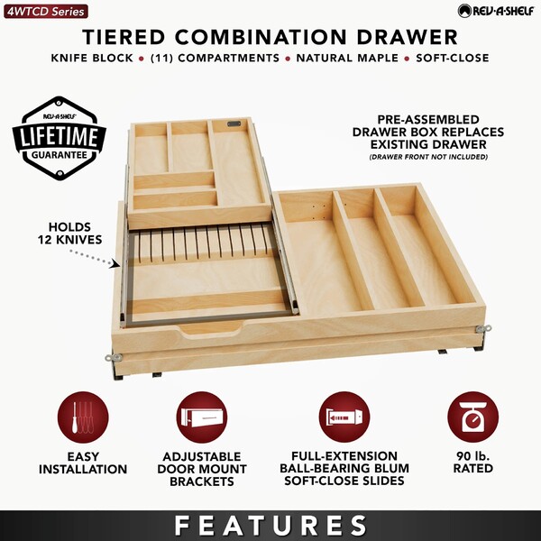 Double up your drawer space with Rev-A-Shelf's Two-Tiered drawer. This drawer box comes pre-assembled and ready to install into your existing cabinet drawer opening.