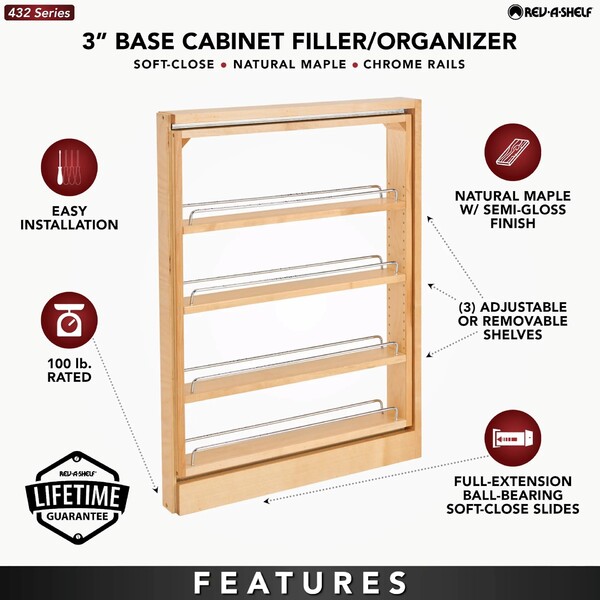 Create a functional storage space behind those decorative panels with this base filler cabinet. We didn’t’ just create another organizer...we created the whole cabinet that transforms decorative filler into useful storage pullouts. The 432 is available for 3”, 6” and 9” base cabinet applications and features adjustable shelves with chrome rails, full-extension ball bearing slides and our three slide design provides the most stable function on the market.