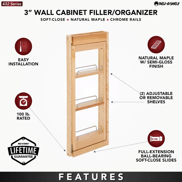Rev-A-Shelf's fillers revolutionized otherwise wasted space in your kitchen. Normally a "filler" or extra space is simply covered up with a decorative front, but with Rev-A-Shelf's line of fillers, it turns that otherwise wasted space in to useful space. Fillers are intended to be installed in new kitchen cabinet construction and will not work in existing cabinets. The 432 Wall Series is available for 3" and 6" widths and features adjustable shelves with chrome rails and full-extension ball bearing slides.