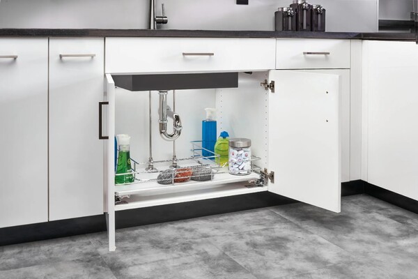 Rev-A-Shelf’s 5386 Pullout U-Shaped Series feature beautiful maple or contemporary gray solid bottoms. Designed for 33” and 36” sink base cabinets, the unique u-shaped frame fits around even the peskiest pipes. Units glide on Blum full-extension, soft-close slides, can be side or bottom mounted and can also be individually door mounted with included brackets.