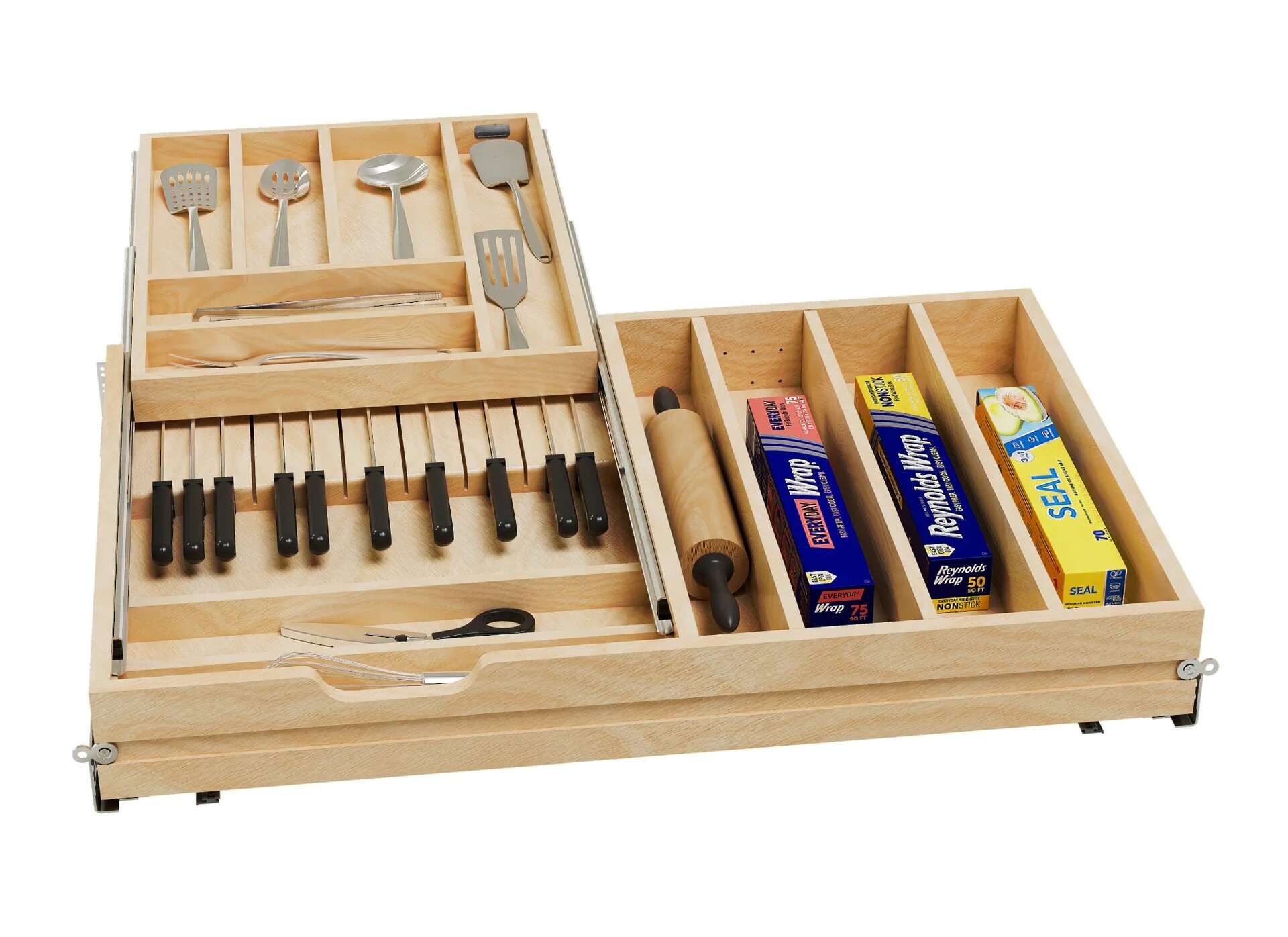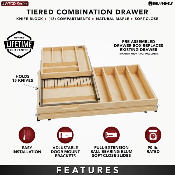 Double up your drawer space with Rev-A-Shelf's Two-Tiered drawer. This drawer box comes pre-assembled and ready to install into your existing cabinet drawer opening.