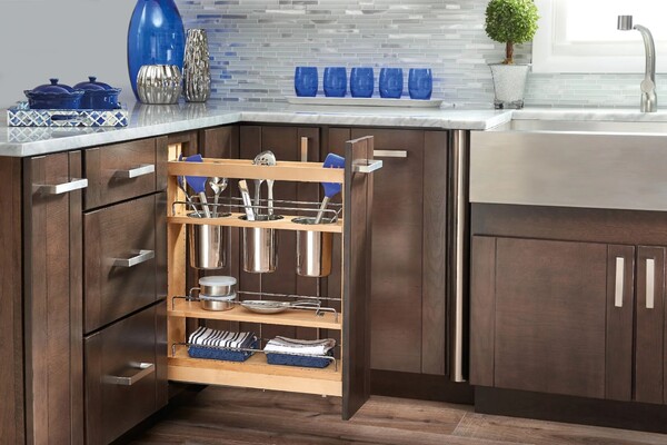 Rev-A-Shelf's beautiful base organizers feature adjustable shelves with chrome rails to help keep everything in its place. Stop digging through drawers for utensils and say goodbye to unsightly, space monopolizing counter bins with the 448UT pullout designed specifically for storing a multitude of utensils. Units glide out on the BLUMOTION soft-close slide system, which is some of the industry best slides. Door mounting is easy with our patented door mount brackets that provide up to 5 inches of flexibility for trouble free installation on any door style.