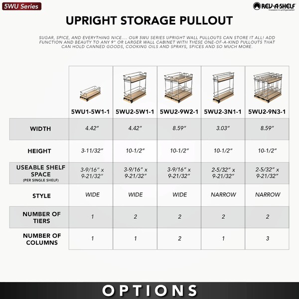 Sugar, spice, and everything nice.... Our 5WU Series Upright Wall Pullouts can store it all! Add function and beauty to your wall cabinet with these one-of-a-kind pullouts that can hold canned goods, cooking oils and sprays, spices and so much more.