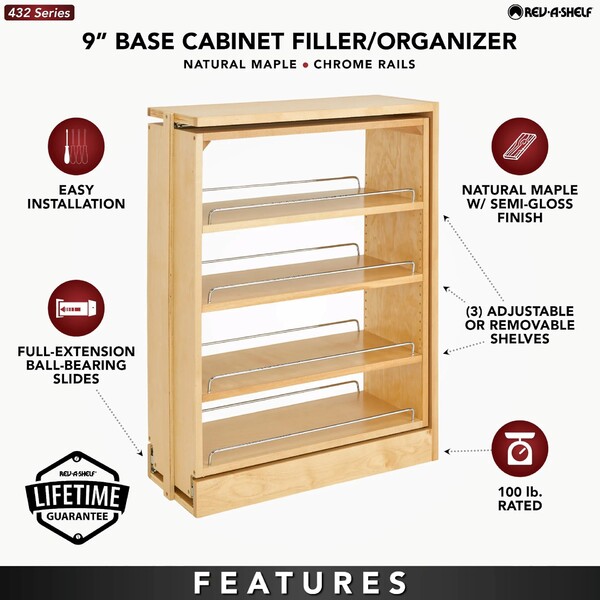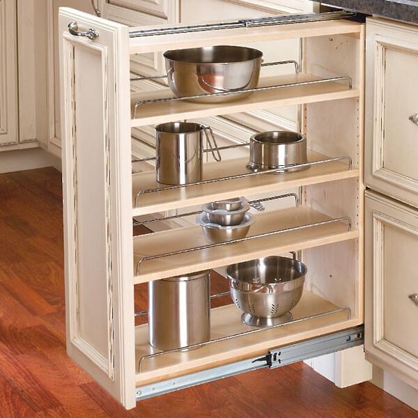 Create a functional storage space behind those decorative panels with this base filler cabinet. We didn’t’ just create another organizer...we created the whole cabinet that transforms decorative filler into useful storage pullouts. The 432 is available for 3”, 6” and 9” base cabinet applications and features adjustable shelves with chrome rails, full-extension ball bearing slides and our three slide design provides the most stable function on the market.