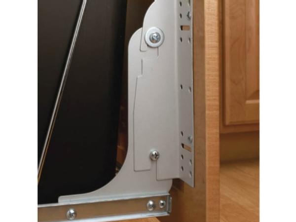 All RV Series Waste Containers and HPRV/HRV Hampers can be attached to the cabinet door for an easy one step process with the Heavy-Duty Door Mount Kit. This system is considered the best in the industry with a six-way adjustable door- mounting bracket for easy installation and simple job site adjustments. The RV DM KIT includes a complete set of brackets, fasteners and spacers for installation on any door style eliminating the need for a sub door panel.
