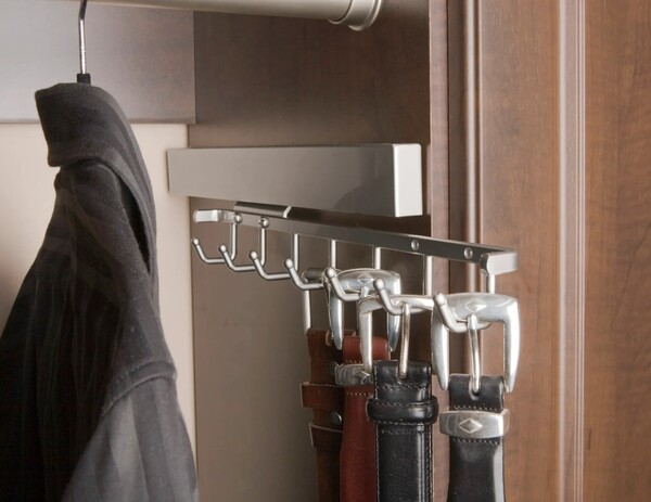 Offering easy to reach storage for your belt, the Deluxe Belt Rack complements our other Deluxe Accessories for storage of ties, scarves, and more. It stores against a closet panel and then slides out when needed from behind clothes on full-extension, ball-bearing, steel slides. See your collection of belts on this elegant rack featuring 7 hooks on a steel frame. It is available for 14" or greater depth panels in several luxurious finishes to match Sidelines By Rev-A-Shelf's other accessories.