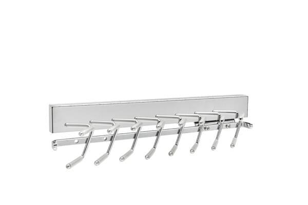 Offering easy-to-reach storage for your ties, the Deluxe Tie Rack complements our other Deluxe Accessories for the storage of belts, scarves, and more. It stores against a closet panel and then slides out when needed from behind clothes on full-extension, ball-bearing, steel slides. See your collection of ties on this elegant rack featuring 16 non-slip hanger arms on a steel frame. It is available for 14" or greater depth panels in several luxurious finishes to match Sidelines By Rev-A-Shelf's other accessories.