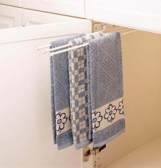 Store dish towels where you need them, right under the kitchen sink. The 563-47 Pullout Towel Bar is the perfect example of user-friendly with 3 prongs that slide-out of the cabinet 12" for total convenience. This Pullout Towel bar is available in white or chrome and features universal brackets for right or left hand mounting.