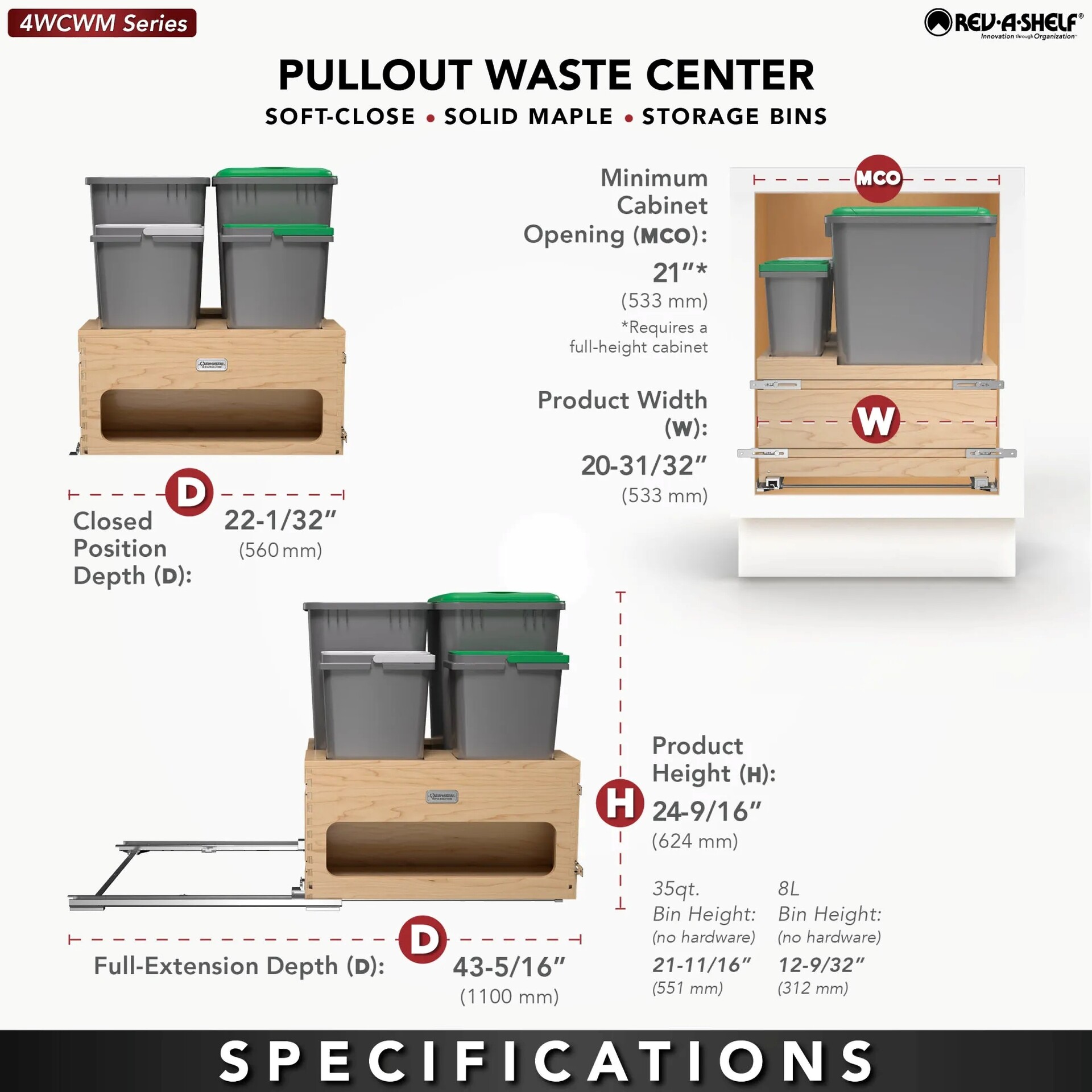 If you are looking for an all-in-one solution for your trash, recycling, and/or organic waste... your search is over! Rev-A-Shelf® is proud to introduce the 4WCWM Series Wood Bottom Mount Waste Management Center. Available with your choice of additional storage on the side or two 8 L containers (perfect for composting) held securely in place with a maple beauty ring, this pullout is a great addition to any kitchen. The maple dovetail frame glides on soft-close slides and boasts a reversible design with a side storage compartment.