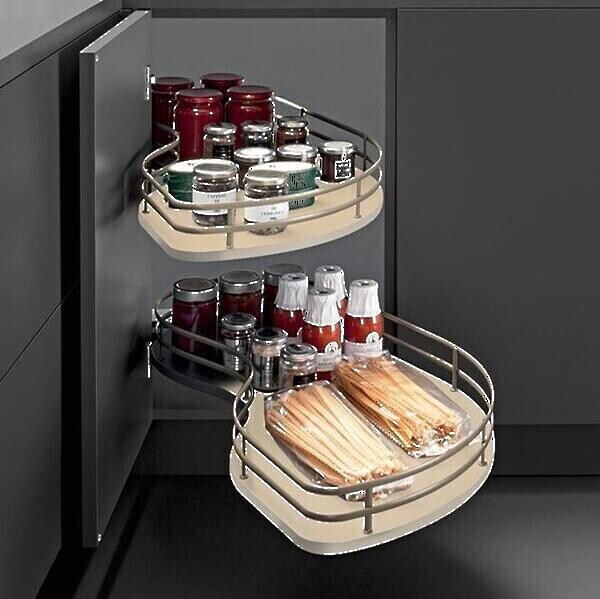 The shelves can be pulled-out independently, trays are designed to increase storage surface, height adjustable shaft, easy to install. The soft-close mechanism is a patented system and can be easily fixed in on one side of the cabinet, non slip melamine surface, for frame and frameless cabinets, load capacity 44 lbs (20kg) per shelf, minimum door opening 85°, height of the shelf rail 70 mm (2-3/4˝ ).
