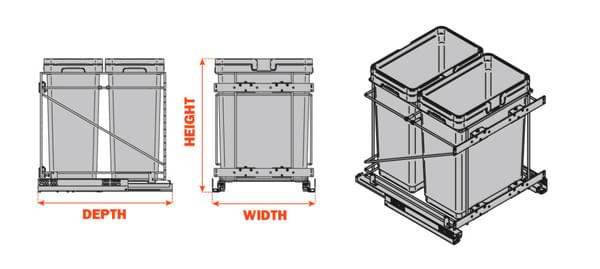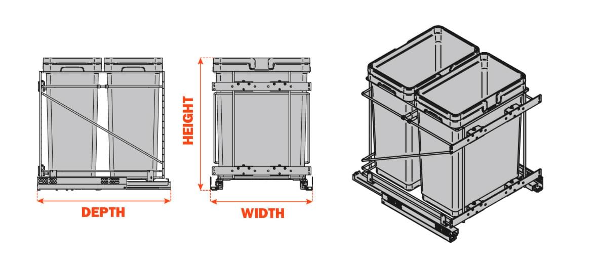 18” Salice Base pull-out waste bins. Soft close, wire bottom, full extension (500mm). Handle and door brackets included. Two 32 Qt. plastic bin. The waste bins are equipped with handles to easily keep your trash bag inside and lift cans up. Bottom mount.